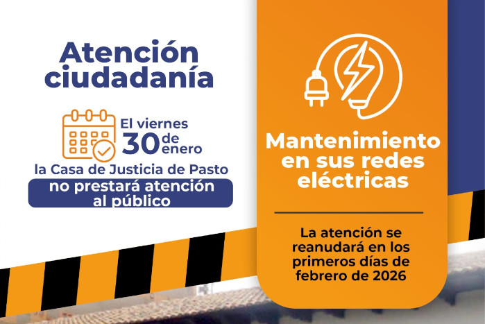 Debido a la ejecución de obras de arreglo, mantenimiento y modernización de las redes eléctricas en la sede de la Casa de Justicia de Pasto, ubicada en la casona